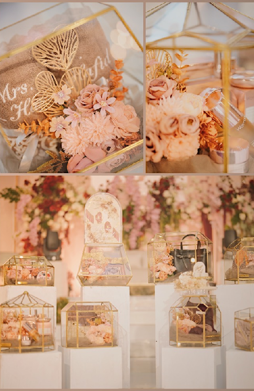 Sewa box & hias seserahan pernikahan. Barang-barang seserahan untuk pernikahan sudah ditata dan dihias dengan cantik menggunakan dekorasi bunga artifisial, pita & lainnya.